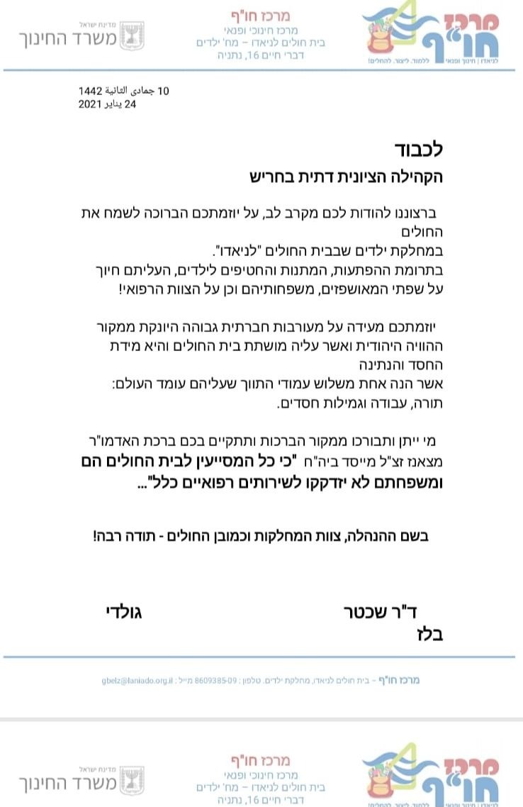 אתמול (א') התבצעה החלוקה במחלקת הילדים בלניאדו.  ד"ר יעקב שכטר, מנהל מחלקת הילדים הביע בשמו ובשם הצוות כולו את תודתו במכתב ששלח לחברי הקהילה: "יוזמתכם מעידה על מעורבות חברתית גבוהה היונקת ממקור ההוויה היהודית ואשר עליה מושתת בית החולים והיא מידת החסד והנתינה. בתרומת ההפתעות, המתנות והחטיפים לילדים, העליתם חיוך על שפתי המאושפזים, משפחותיהם, והצוות הרפואי".